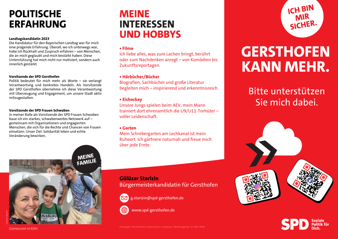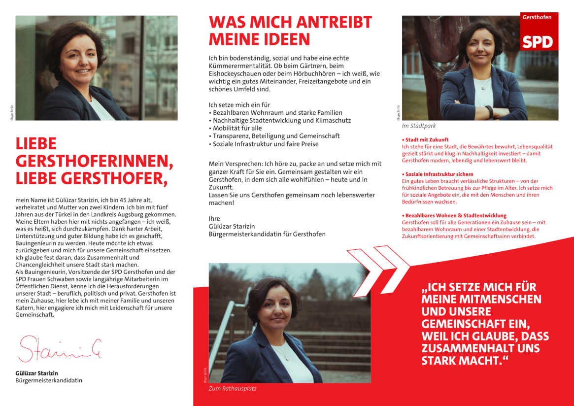 mein Name ist Gülüzar Starizin, ich bin 45 Jahre alt, verheiratet und Mutter von zwei Kindern. Ich bin mit fünf Jahren aus der Türkei in den Landkreis Augsburg gekommen. Meine Eltern haben hier mit nichts angefangen – ich weiß, was es heißt, sich durchzukämpfen. Dank harter Arbeit, Unterstützung und guter Bildung habe ich es geschafft, Bauingenieurin zu werden. Heute möchte ich etwas zurückgeben und mich für unsere Gemeinschaft einsetzen. Ich glaube fest daran, dass Zusammenhalt und Chancengleichheit unsere Stadt stark machen. Als Bauingenieurin, Vorsitzende der SPD Gersthofen und der SPD Frauen Schwaben sowie langjährige Mitarbeiterin im Öffentlichen Dienst, kenne ich die Herausforderungen unserer Stadt – beruflich, politisch und privat. Gersthofen ist mein Zuhause, hier lebe ich mit meiner Familie und unseren Katern, hier engagiere ich mich mit Leidenschaft für unsere Gemeinschaft.